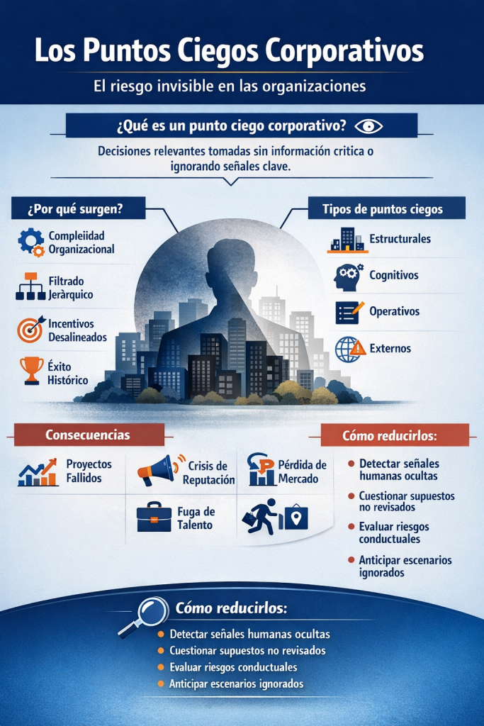 Los puntos ciegos corporativos aparecen cuando el control genera una falsa sensación de comprensión. Cuanto más compleja es una organización, más sofisticados son sus sistemas de monitoreo… y mayor es la probabilidad de que surjan zonas donde la información se distorsiona, se diluye o simplemente no fluye.